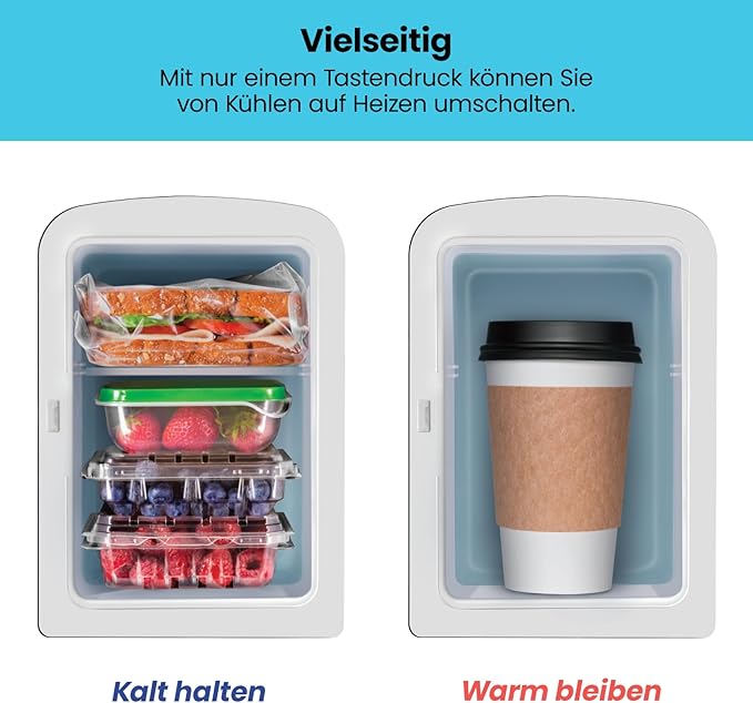 - Компактен размер: капацитетът от 4 литра охлажда шест кутии безалкохолни напитки от 350 мл. Вътрешността е 5 x 5 x 7,5 инча и разполага с подвижна тава, където можете да съхранявате малки предмети като кисело мляко, плодове, мляко, сок, смутита, бутилки, сирене, кафе или продукти за грижа за кожата.