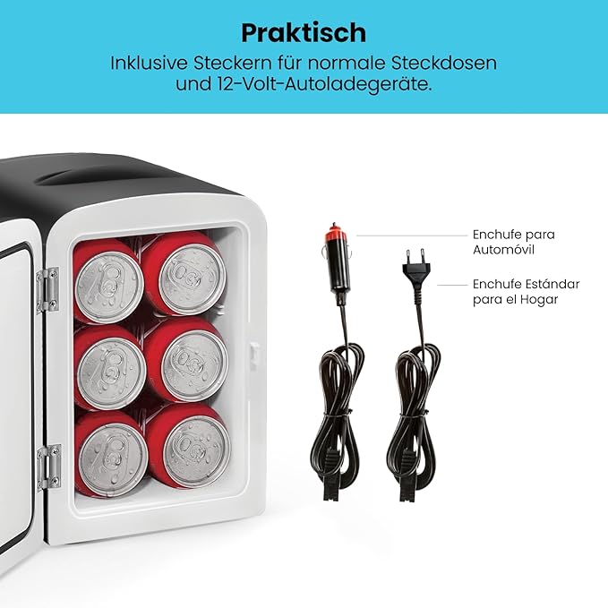 - ЕКОЛОГИЧЕН И ПОДХОДЯЩ ЗА ПЪТУВАНЕ: Този преносим мини хладилник е 100% без фреон и екологичен. Можете да свържете продукта към обикновени битови контакти и 12V зарядни устройства за кола. (2 щепсела са включени).
