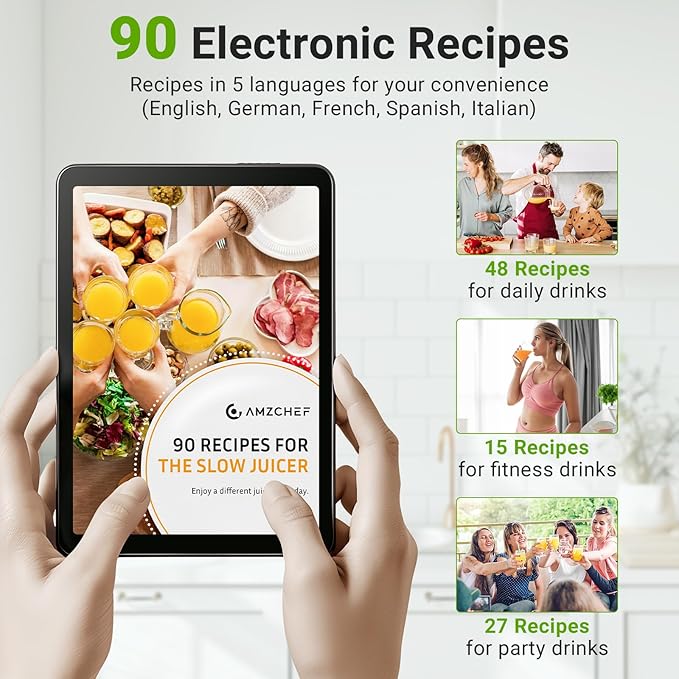 - Малък сокоизстисквачка: Студено пресоващите сокоизстисквачки AMZCHEF с малък отвор за подаване ви позволяват да отстранявате семките при рязане на плодовете, което намалява горчивината и води до по-вкусен сок. Бавният дизайн за смилане също така помага за предотвратяване на наранявания на деца по време на изцеждане.