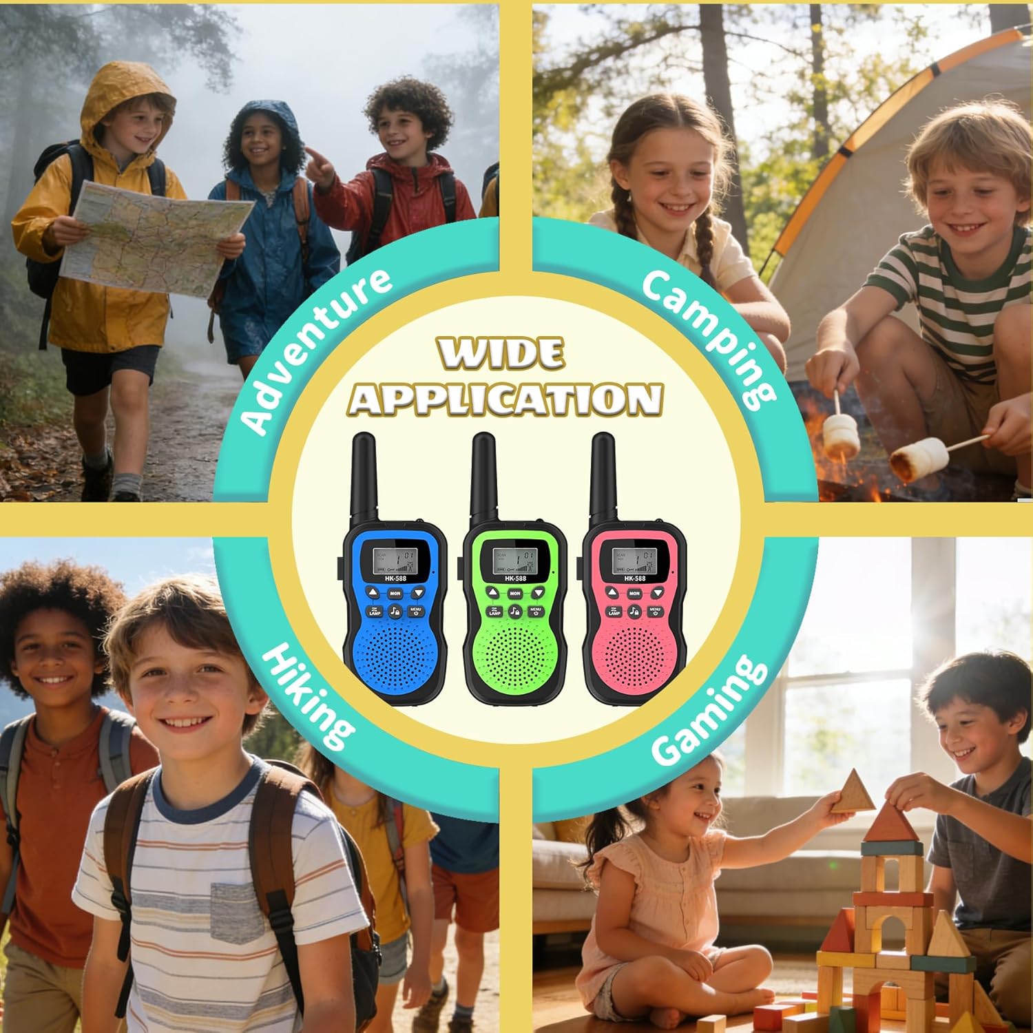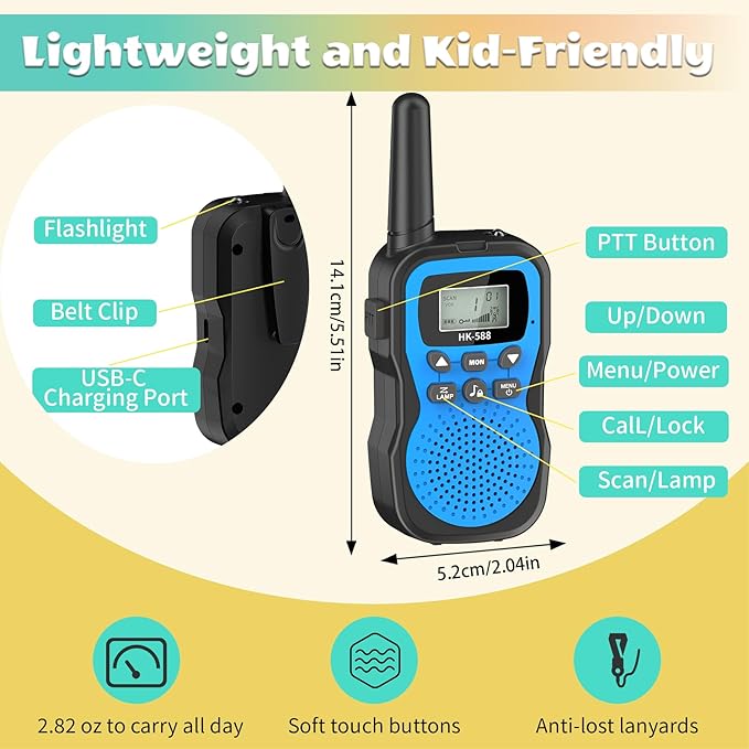 - VOX функция, фенерче и каишка за колан: Детските радиостанции (3 броя) се предлагат с подвижна каишка за колан и щипка за колан, лесни за носене навън. Функцията за свободни ръце VOX позволява на децата да говорят свободно по време на дейности на открито. Вграденото фенерче отгоре може да се използва за осветление през нощта. Изработени от ABS материал и с тегло само 80 грама, те са леки, издръжливи и устойчиви на падане, лесни за носене и много практични.