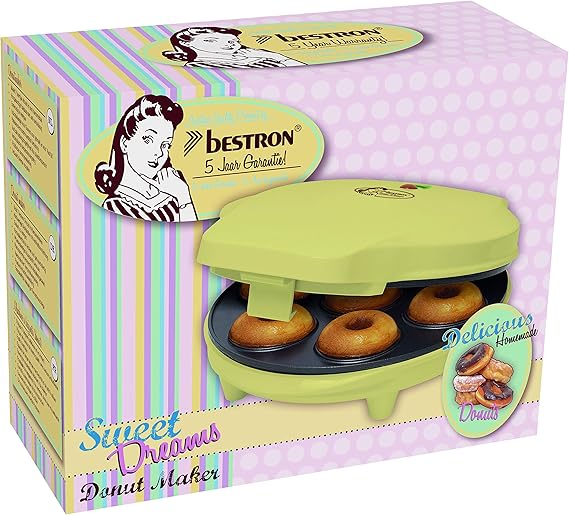 - Съдържание на кутията: 1 x машина за понички Bestron, мощност 700 W, тегло 1,25 кг, материал пластмаса/метал, размери 25,5 x 20 x 9,5 см, жълта, ADM218SD