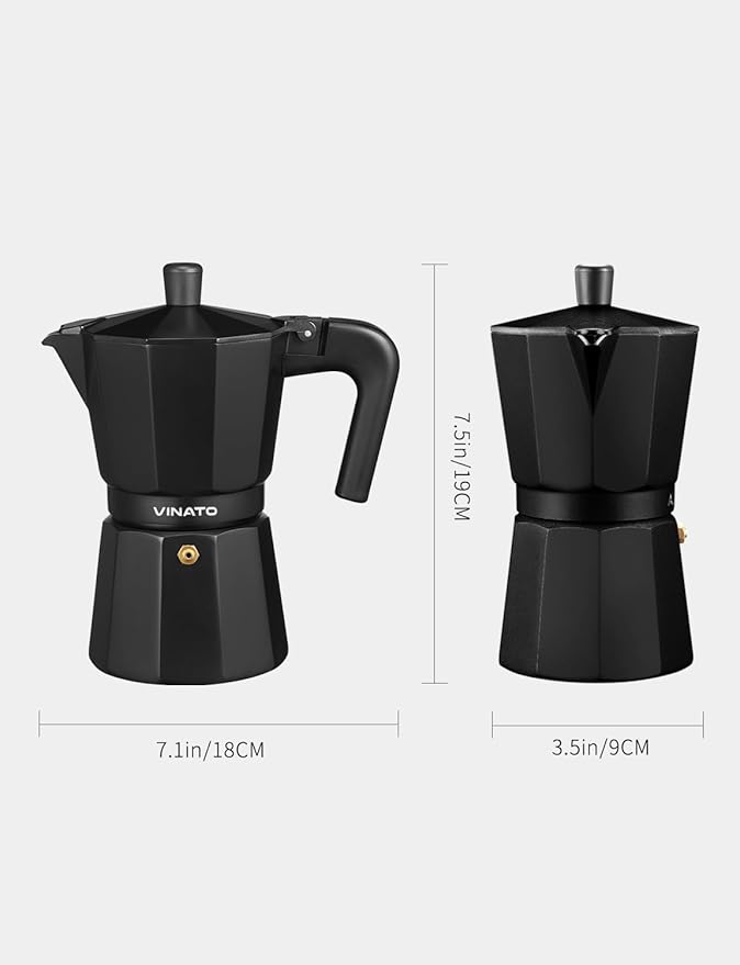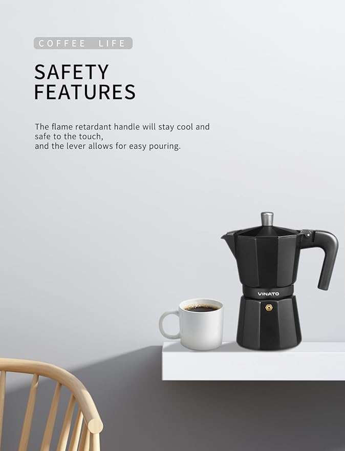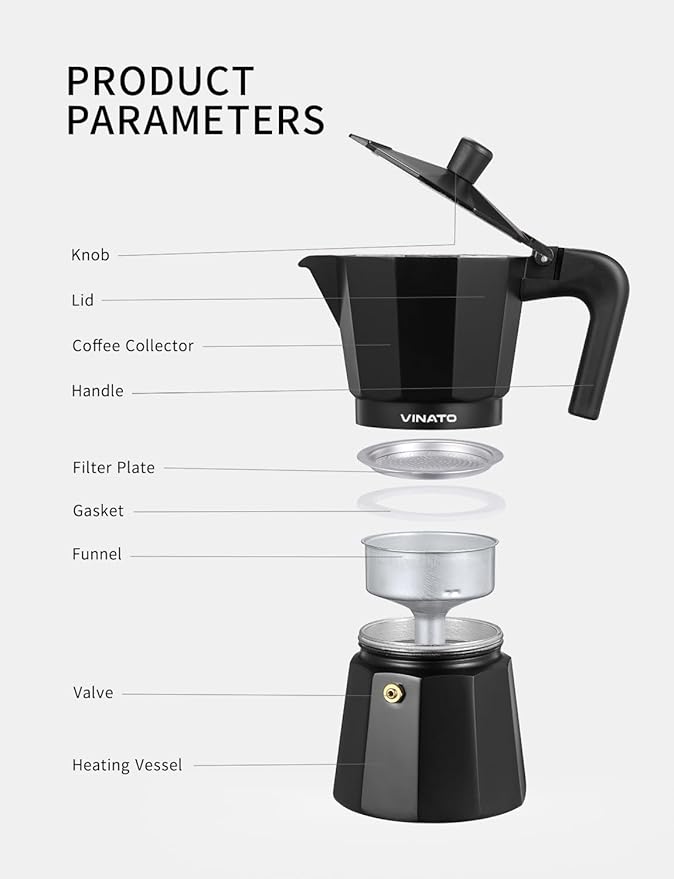 - Високо качество: еспресо машината VINATO е изработена от висококачествен алуминий, което осигурява дълъг експлоатационен живот, а също така гарантира равномерно предаване на топлината и запазва характерния аромат на истинското еспресо.
