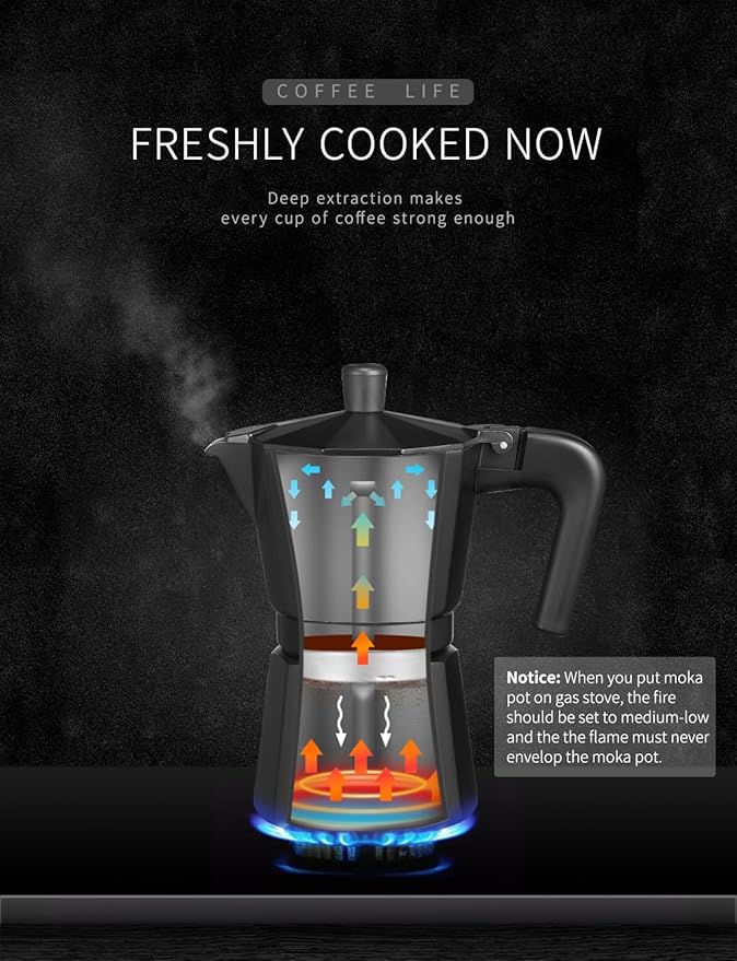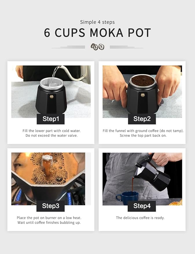 - Подходяща за широка гама от печки: тази кафеварка за мока е подходяща за почти всички видове печки: газови печки, електрически печки, печки на алкохол, керамични печки и къмпинг печки. Независимо кой източник на топлина предпочитате, кафеварката за еспресо ще отговори на вашите нужди и ще произведе кафе с отлично качество.