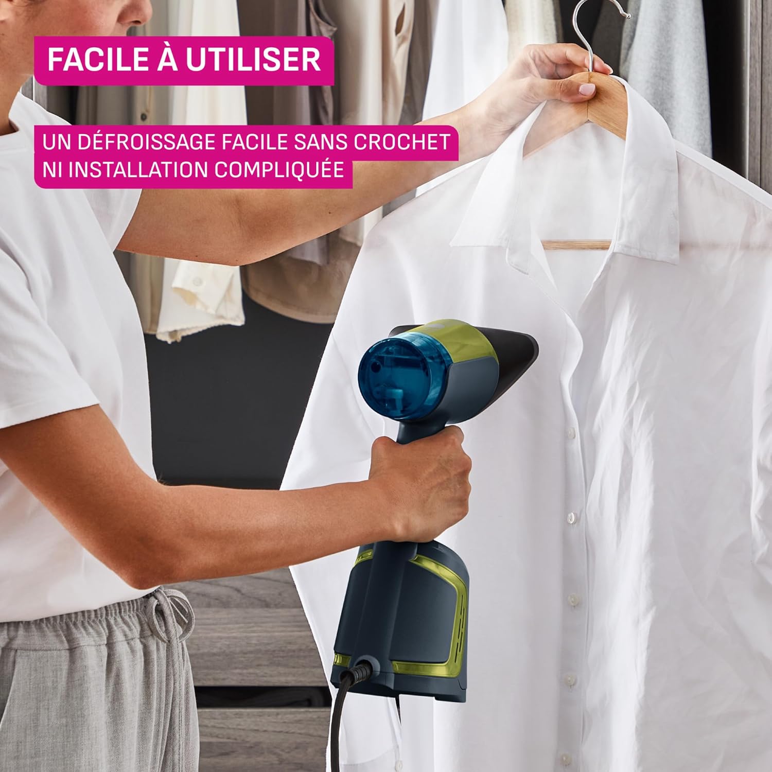 - ОПРОСТЯВА ВАШЕТО ЕЖЕДНЕВИЕ: Лесно гладене с пара, без регулиране, без дъска за гладене или кука, лесен за пълнене подвижен резервоар от 100 мл за гладене на до 3 ризи или 4 тениски