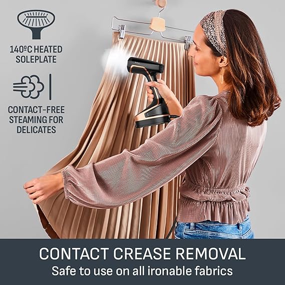 - КОНТАКТНО ПРЕМАХВАНЕ НА ГЪНКИ: Изгладете упорити гънки, като притиснете нагрятата гладеща плоча на 140°C към плата. Безопасно за употреба върху всички подходящи за гладене тъкани.