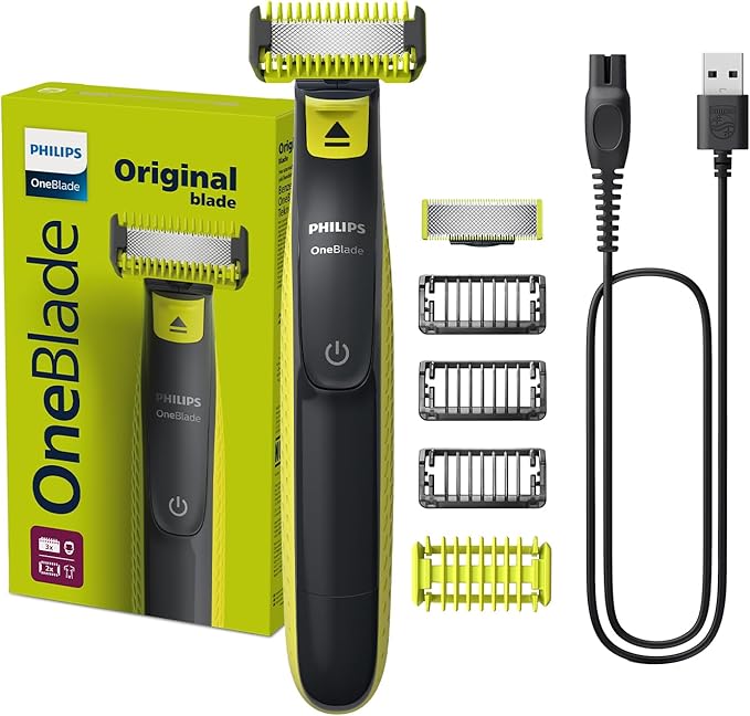 - Комплектът включва: 1 x Philips OneBlade 360, 2 x 360 ножчета, 3 x гребен за брада (1,3,5 инча), 1 x капачка за съхранение, 1 x мек калъф, ръководство за потребителя; захранващият адаптер не е включен