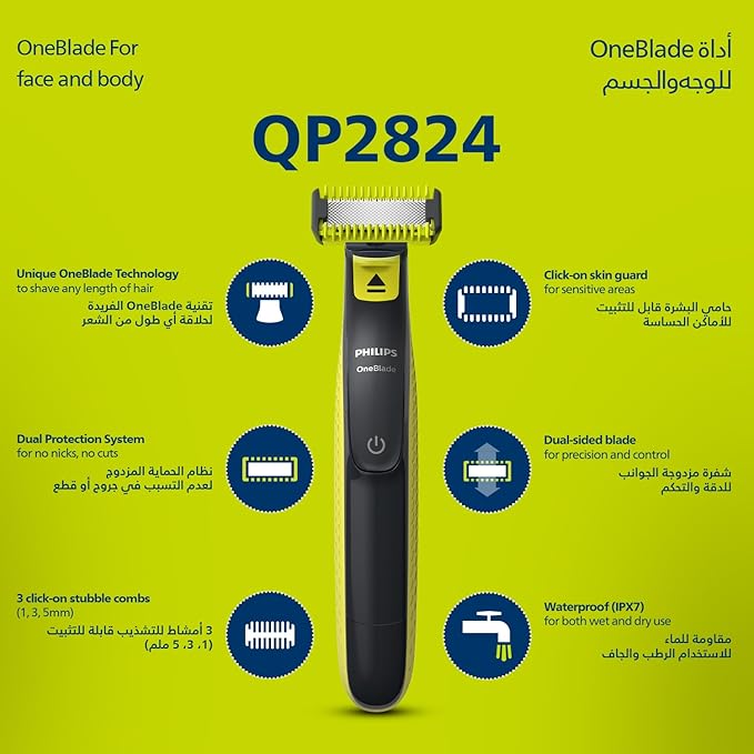- Технология OneBlade: бързорежещият елемент (12 000 движения в минута) е ефективен дори при дълги косми; системата за двойна защита с гладко покритие и заоблени ръбове прави бръсненето по-лесно и по-комфортно