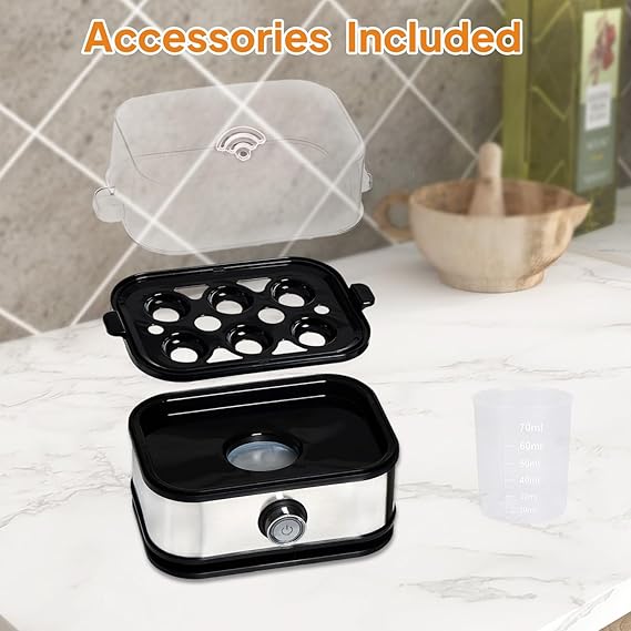 - Компактен и стилен дизайн: С размери само 18,5*13*13,5 см, дизайнът от неръждаема стомана на тази тенджера за яйца пасва безпроблемно на всеки плот, като същевременно добавя модерен стил. Включена е мерителна чаша с вградена игла за пробиване. Идеална за натоварени кухни, тази електрическа тенджера за яйца балансира елегантен дизайн с практична функционалност, правейки всяко готвене на яйца безпроблемно и без цапане.