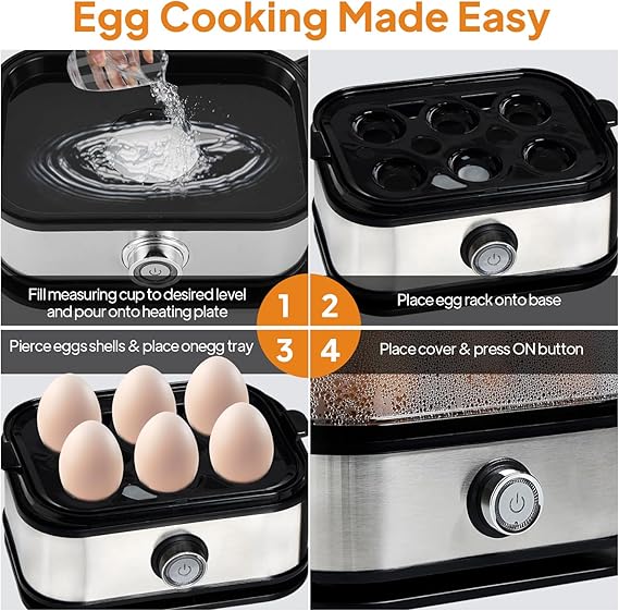 - Универсален уред за готвене на яйца: Освен яйца, този електрически уред за готвене на яйца на пара се справя и със зеленчуци, кнедли и бебешка храна. Многофункционалният му дизайн ви позволява да готвите на пара питателни ястия без усилие, съчетавайки прецизност при варене на яйца с кухненска гъвкавост. Перфектен за бързо и здравословно готвене – вашият предпочитан инструмент за яйца и не само.