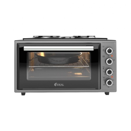 Мини фурна 50 литра, таймер и термостат, мощност на фурната – 1600 W, 0+5 функции, биметален термостат, нагревателен елемент тип M (отгоре и отдолу), емайлирана вътрешна кухина (ляв-десен-горен-долен панел), метална защита срещу съпротивление, щепсел от европейски тип , 1 квадратна тава + 1 Cr-Ni решетка, 1 кръгла тава U тип уплътнение, двойна стъклена врата на фурната, стиропор + кутия, лампа, турбо вентилатор, , ПЪЛНО СИВО, ЧЕТИРИ КОНТРОЛА, ИЗКЛЮЧЕН КОТЛОН (Ако котлонът работи, фурната няма да работи.) 3 КОТЛОН