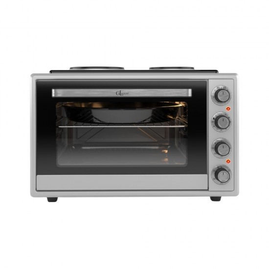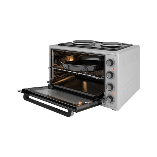 70 литрова мини фурна, таймер и термостат, мощност на фурната – 2000 W, 0+5 функции, биметален термостат, нагревателен елемент тип M (отгоре и отдолу), емайлирана вътрешна кухина (ляв-десен-горен-долен панел), щепсел от европейски тип, 1 квадратна тава + 1 Cr-Ni решетка, 1 кръгла тава тип U с уплътнение, двойна стъклена врата на фурната, стиропор + кутия, лампа, турбо вентилатор, НАПЪЛНО СИВ, ЧЕТИРИ КОНТРОЛА, ИЗКЛЮЧЕН КОТЛОН (Ако котлонът работи, фурната няма да работи.) 2 КОТЛОНА