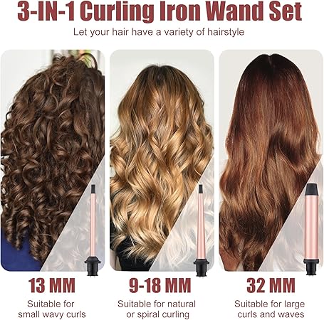 Дизайн на 3 модерни прически: Комплектът с маша с 3 глави съдържа 3 взаимозаменяеми тръби, включително голяма 32 mm маша за естествени и свободни вълни, 9-18 mm конус за маша за създаване на насложени къдрици и 13 mm коса маша за коса Малки и стегнати прически D. Няма нужда да ходите в салона и да се насладите на различна прическа при дома.
