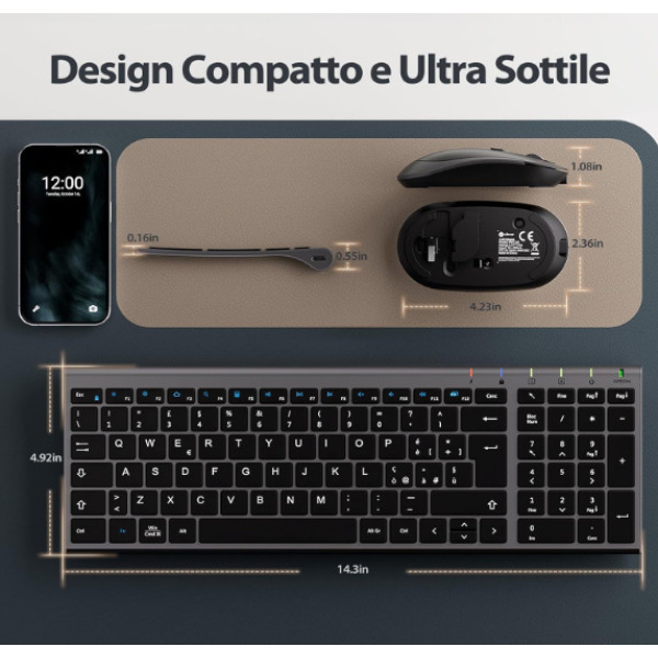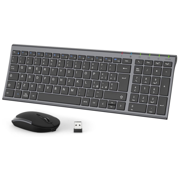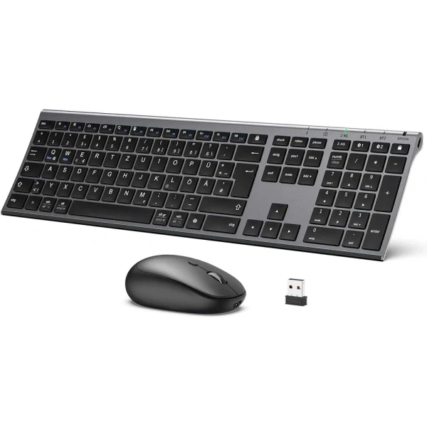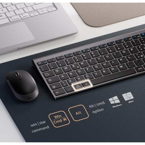 Компактен, ултратънък, тих дизайн. Компактната безжична клавиатура с пълен размер (99 клавиша, включително цифрови) елиминира досадното писане с безшумни клавиши. Клавишите и мишката предлагат изключителни противоплъзгащи свойства, така че можете да забравите за усещането за хлъзгане.