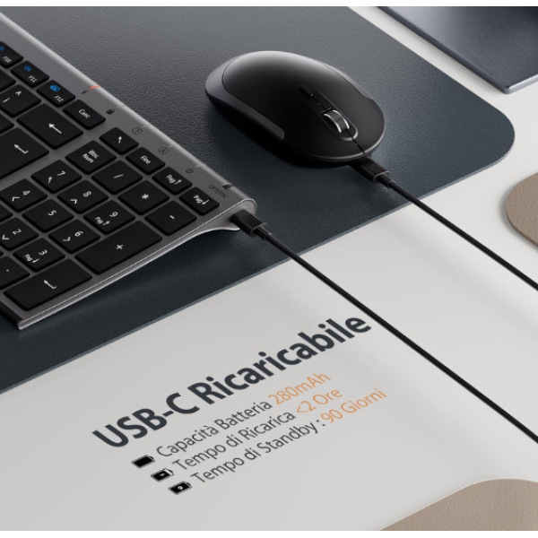 Акумулаторна батерия с напомняне. Клавиатурата iClever осигурява до 90 часа живот на батерията с едно зареждане, което издържа приблизително 2 часа (280 мАч). Когато батерията е изтощена, индикатор в горния десен ъгъл светва червено, предупреждавайки ви. Ако не извършвате никакви действия повече от 10 минути, безжичната клавиатура и мишка влизат в режим на готовност.