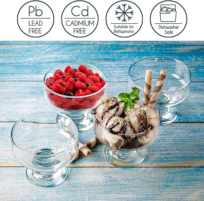 - Универсални десертни купи: Мини десертните чаши с дръжки са идеално допълнение към колекцията ви от домашна кухня или във вашия магазин. Удобен в ръката, широк крак за лесно боравене. Идеален за представяне на вашите десерти. Подходящ за съдомиялна машина и хладилник. Вместимост: 265 мл. Перфектен размер, за да се насладите на сладоледа си