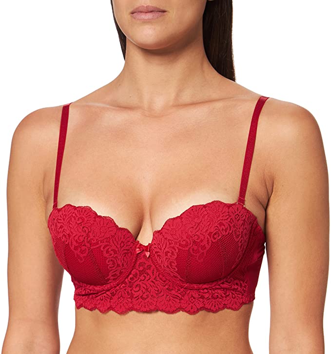 Изрязана от прозрачна, еластична дантела, която приляга нежно към кожата Дизайнът без презрамки се отличава с лека подплата, долна жила и по-широк ластик на гърба, за да осигури опора без хлъзгане Конвертируемите презрамки могат да се носят по пет различни начина: без презрамки, презрамки, на едно рамо, прави или кръстосани отзад