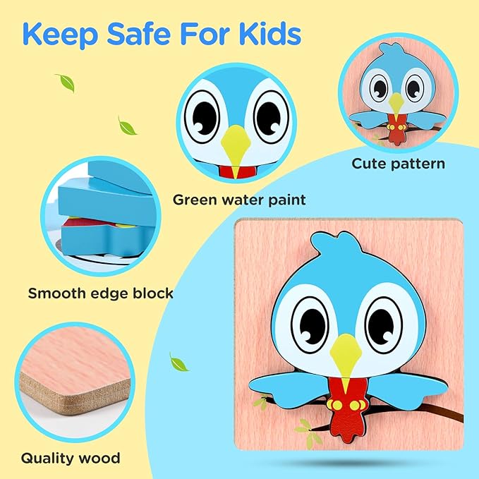 - Безопасни и висококачествени материали: Детските пъзели са изработени от висококачествена, екологично чиста дървесина, преминали са строги тестове за безопасност и са боядисани с безопасна боя на водна основа, за да се запази цветът на шарката непроменен за дълго време.
