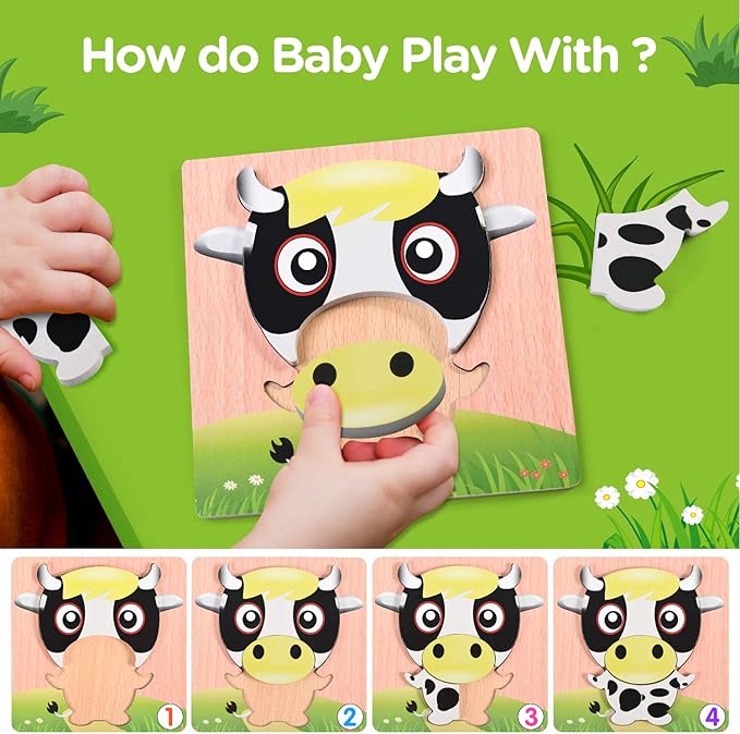 - Ярки цветове, сладки шарки: Пъзелите за малки деца включват 4 сладки животински шарки: крава, миеща мечка, папагал и динозавър, с ярки и живи цветове, които ще вдъхновят дългосрочния интерес на децата.