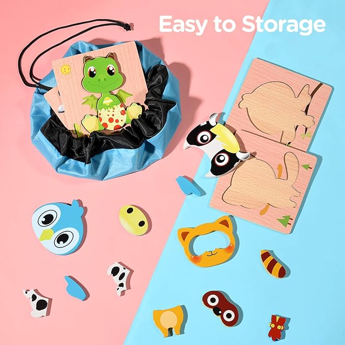 - Многофункционална чанта за съхранение 2 в 1: Комплектът дървени пъзели се предлага с удобна чанта за съхранение. След като децата приключат с играта, можете да използвате чантата за лесно и удобно съхранение. Чантата може да се използва и като подложка за пъзел.