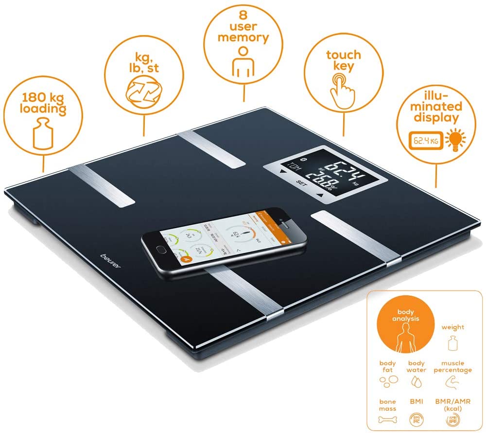 Прецизен анализ на тялото: В допълнение към вашето тегло, везната определя телесните мазнини, телесната вода и мускулния процент, както и костната маса.