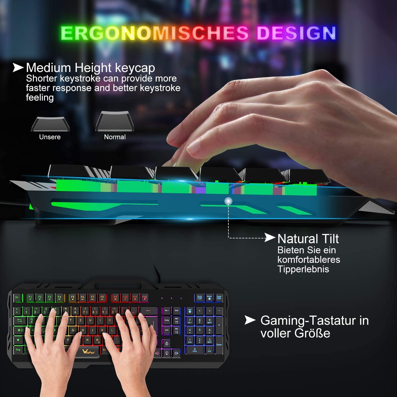 Материал с първокласно качество: Геймърската клавиатура WisFox е изработена от висококачествен метал, устойчив на удари и износване. Подобното на кожата гумено покритие осигурява деликатно усещане. Изключително тънък плаващ дизайн на капачката на клавишите, височината е само наполовина по-висока от тази при обикновените клавиши. Уникалните лазерни UV гравиращи фигури позволяват лесно писане на тъмно.