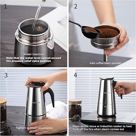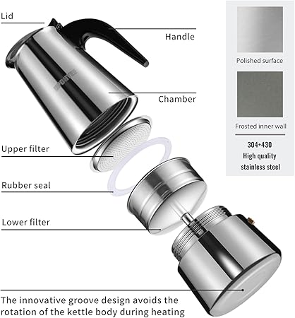 - Материал от неръждаема стомана: Горният съд на италианската индукционна кана е изработен от неръждаема стомана 304, която е издръжлива и устойчива на високи температури, така че кафето да може да осигури пълен аромат при високи температури. Долната тенджера е изработена от неръждаема стомана 430, която може да се приложи към индукционна печка и да се нагрява по няколко начина, което е лесно и удобно.