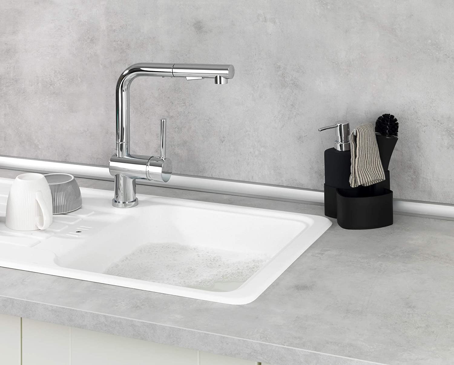 Функция 4 в 1: Създайте организирана мивка, за да спестите място, дръжте всичко на едно място с практичния комплект за мивка Empire: дозатор за препарат, четка за съдове, кърпа и държач за гъби.