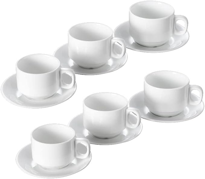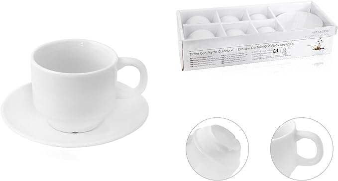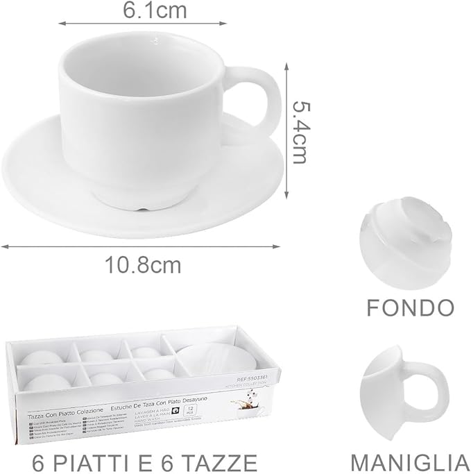 - Комплект от 6 чаши за еспресо с бяла керамична дръжка, 70 мл, включени 6 чинийки. Чашата е с диаметър 61 мм и височина 54 мм. Диаметър на плочата: 108 мм