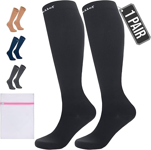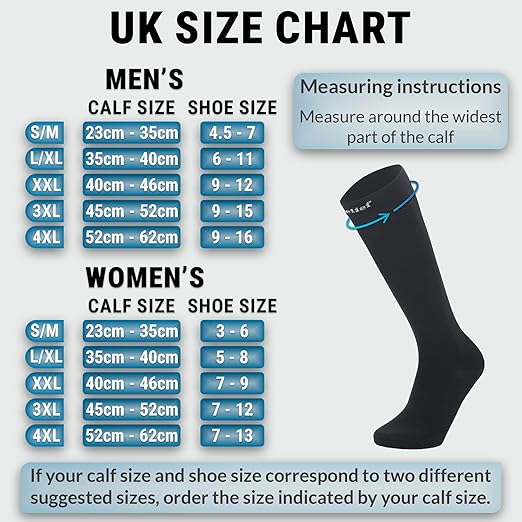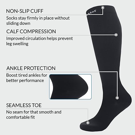 - ИДЕАЛЕН ЗА БОЛНИ КРАКА И ДИСКОМФОРТ В КРАКАТА: Слабата циркулация в краката ви може да причини дискомфорт или стягане. Нашите компресионни чорапи могат да помогнат, като предоставят облекчение. Те са предназначени да упражняват леко натиск върху краката ви, което може да помогне за облекчаване на дискомфорта. Плътното прилепване около прасците също помага за намаляване на вероятността от проблеми с краката като крампи и подпухналост.