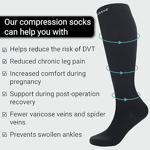 - ЧОРАПИ ЗА ПЪТУВАНЕ: Компресионните чорапи са чудесни за пътуване, особено за дълги полети, тъй като помагат за подобряване на кръвообращението и намаляват проблеми като подути глезени и дискомфорт по време на пътуване.
