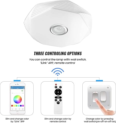 - 【Управление чрез приложение, множество режими】Можете да използвате приложението „iLink“, за да управлявате таванното осветление. Например, да регулирате яркостта, цветната температура и RGB цвета и др. Таванното осветление има различни режими на осветление. Режим „Дихане“: Яркостта и цветът се променят бавно, както при дишане. Режим „Мигане“: Ефект на сценична светлина, бързо превключване на светлината. Режим „Музика“: Осветлението се променя в ритъма на музиката.