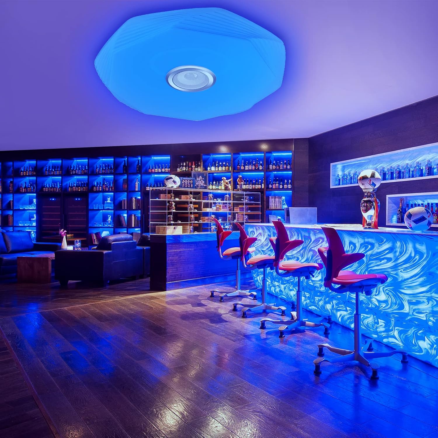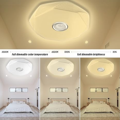 - 【Регулируема яркост и режим на осветление】Тази 48W плафонна лампа предлага разнообразие от режими на осветление: топло бяло, естествено бяло, студено бяло, RGB цвят по ваш избор. Можете също така свободно да регулирате яркостта на светлината (максимум 4000 лумена). Може да се регулира според околната среда, светлината следва ритъма на музиката, за да създаде различна атмосфера.