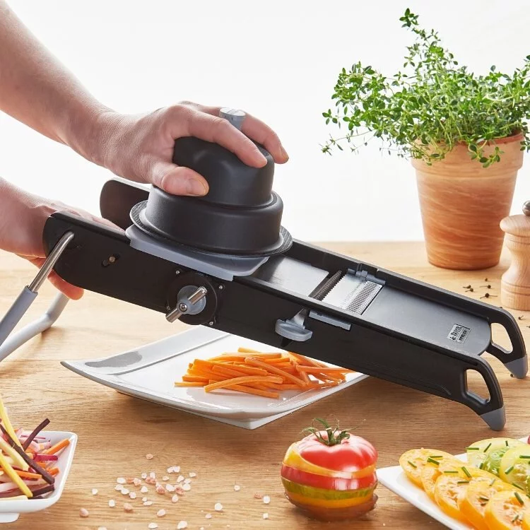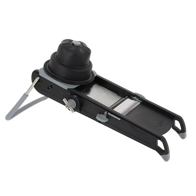- Гладката рампа от неръждаема стомана с формата на пчелна пита осигурява отлично плъзгане на храната. Височината му се регулира благодарение на нова система за регулиране, която ви позволява лесно да регулирате дебелината на рязане от 0,5 до 10 mm, със стъпка от 0,5 mm.