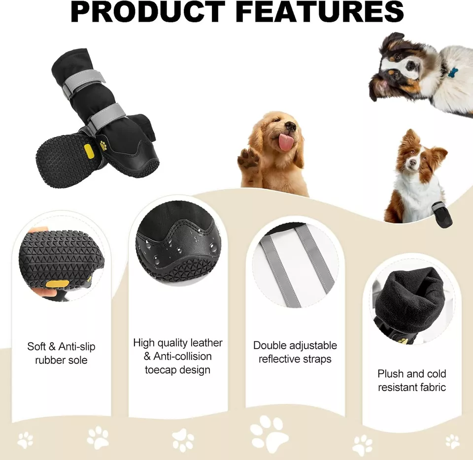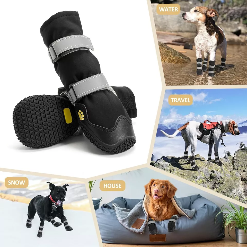 - СИГУРНОСТ: Водоустойчивите кучешки ботуши за наранени лапи осигуряват на вашето куче стабилност и сцепление, предпазват лапите му от горещо или студено време и остри предмети. Дизайнът на отразяващата лента прави вашите кучета видими при условия на слаба светлина, подобрява безопасността през нощта или в мъгливи дни.