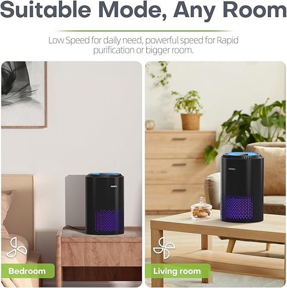 - 【Опционален режим на скорост и силно пречистване】Ако искате бързо да смените въздуха или да използвате този пречиствател на въздух за спалня в нова къща, стая, която дълго време не използвате, можете да изберете режим на висока скорост; за ежедневна употреба можете да настроите режим на нормална скорост.