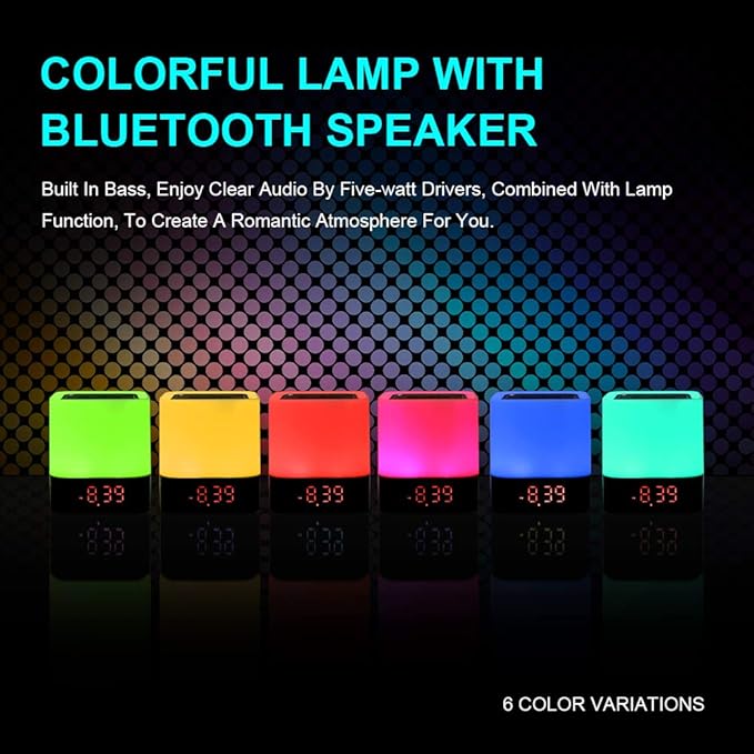 - 【5 в 1 Супер многофункционален високоговорител】Този преносим Bluetooth-съвместим високоговорител с 4.0 HiFi + нощна лампа с сензорно управление + цифров будилник + MP3 плейър + Hands Free разговори! Този Bluetooth-съвместим високоговорител с будилник поддържа също вход за micro SD карта, AUX вход и флаш устройство.
