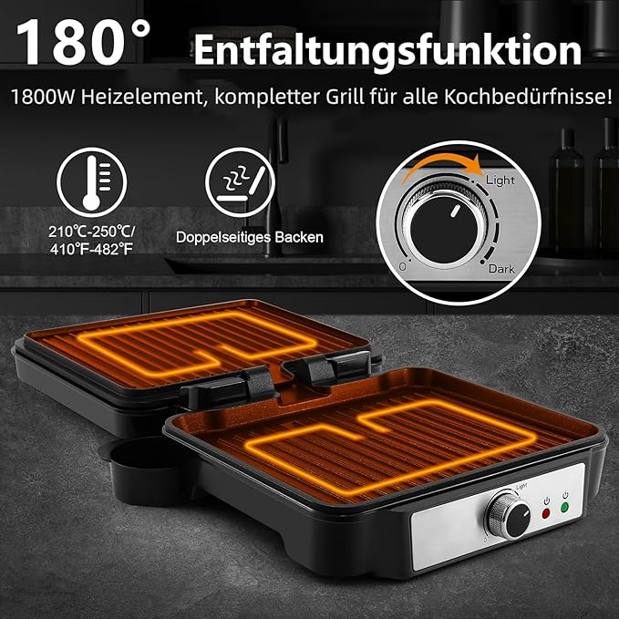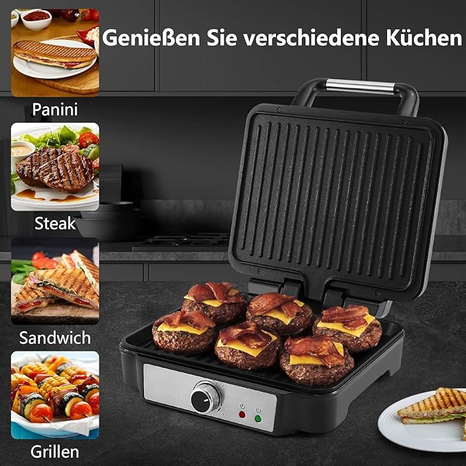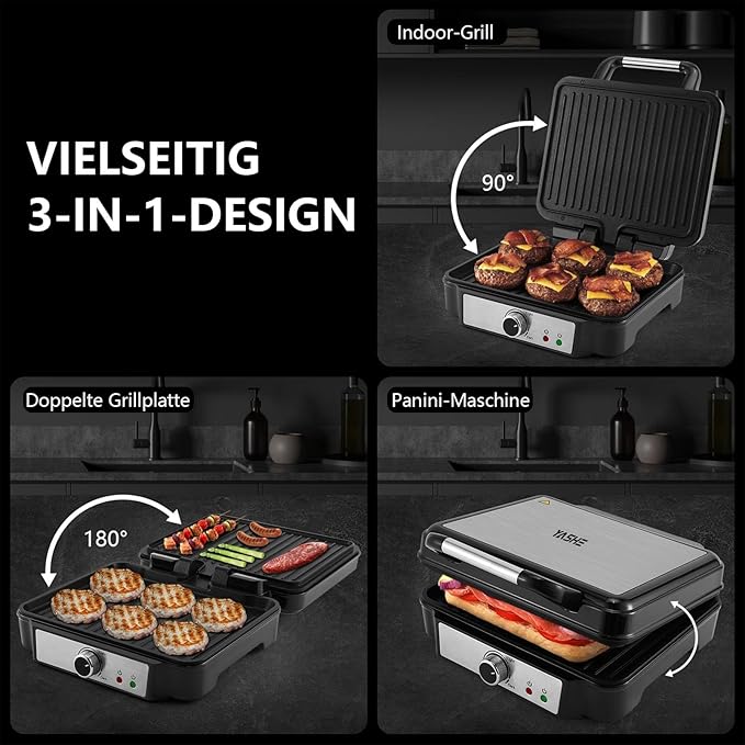 - ГЪВНООБРАЗНА И ЕФЕКТИВНА ФУНКЦИОНАЛНОСТ 3 В 1 Уредът за сандвичи YASHE Panini Press е нещо повече от уред за приготвяне на панини. Когато се отвори на 180°, той се трансформира в голям електрически контактен грил (XXL) с две просторни 28,0 x 23,0 см незалепващи плочи, идеални за печене на пържоли, сандвичи, панини, зеленчуци и др. 1800 W висока мощност и дори двустранна технология за нагряване осигуряват бързи и вкусни резултати за всичките ви нужди за барбекю на закрито