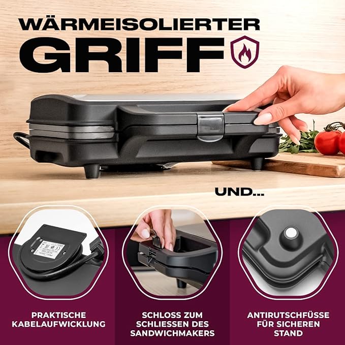- Основни характеристики – С помощта на оптималното разпределение на топлината и автоматичния регулатор на температурата, вашият сандвич ще се запече бързо и равномерно – лесно или хрупкаво – вие решавате как предпочитате да го ядете.