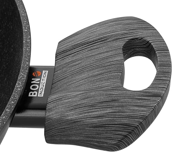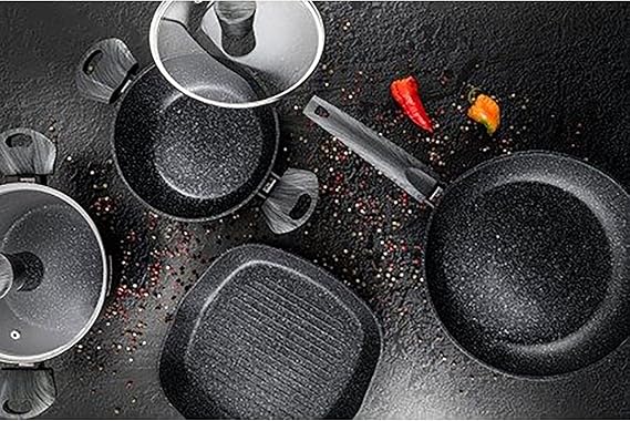 - Висококачествено незалепващо покритие: вътрешността на тигана е снабдена с мраморно незалепващо покритие, което предотвратява залепването на храната, дори ако е приготвена с минимално количество олио или мазнина.