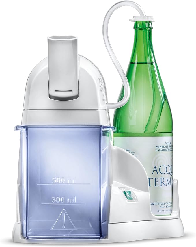 - УДОБНО: Благодарение на интегрирания държач за бутилка с вода, това устройство е практично и безопасно, идеално за горещо-влажни инхалации. Приготвя се само за няколко минути: бойлерът трябва да се напълни с 300 ml деминерализирана или питейна чешмяна вода.