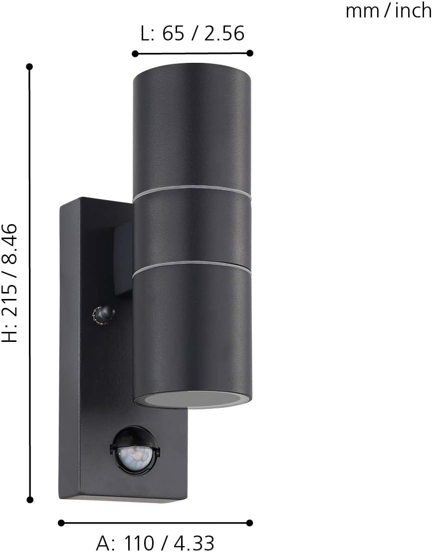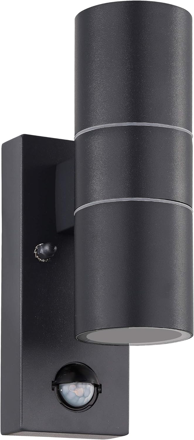 Тази стенна лампа Riga 5 от външната колекция е изработена от поцинкована стомана под формата на антрацит. Има инфрачервен сензор с радиус на засичане 100° и радиус на действие 6 метра. Осветителното тяло е оборудвано със степен на защита IP44 и две лампи GU10.