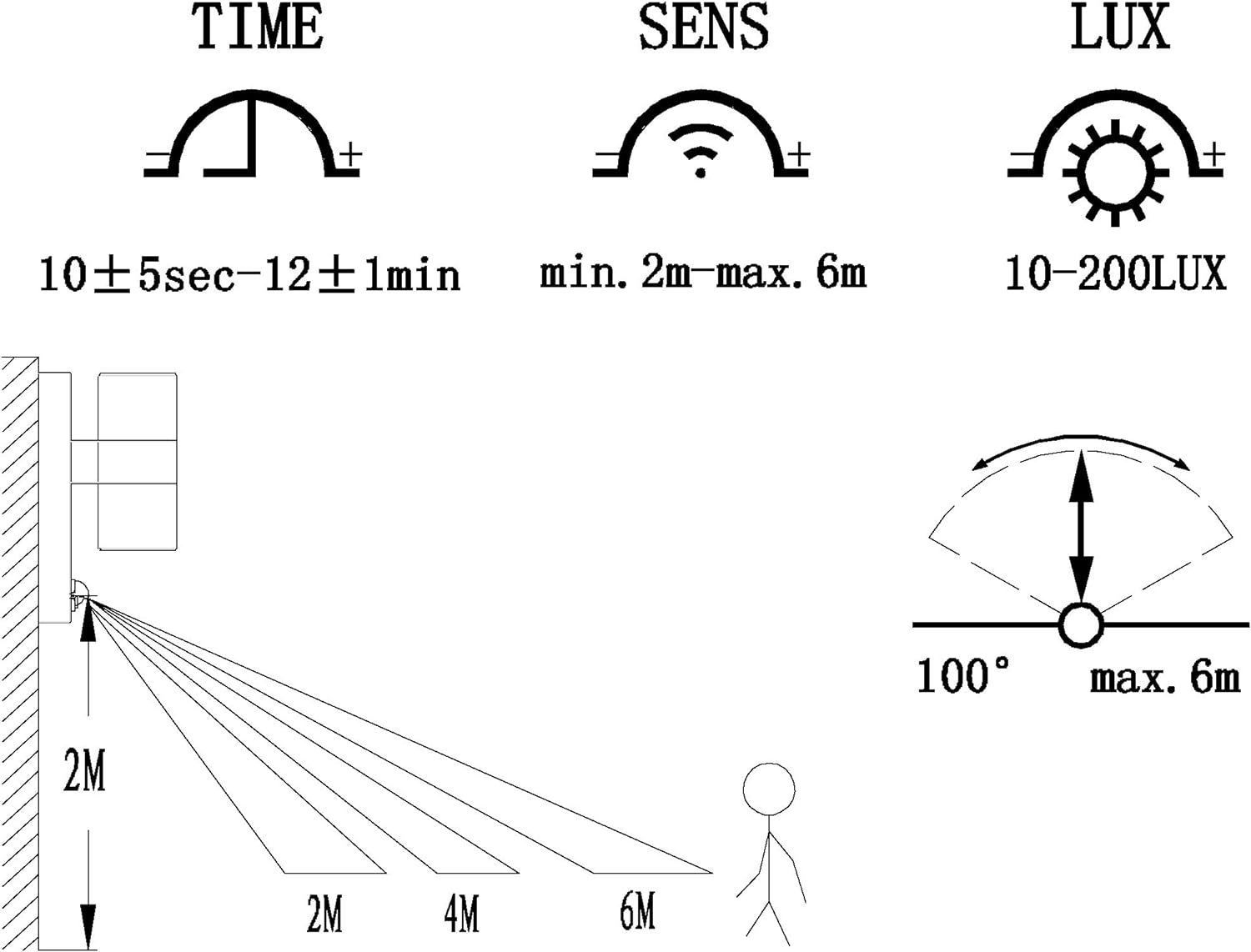 Детекторът за движение е с ъгъл на засичане 100°, обхват до 6 m.