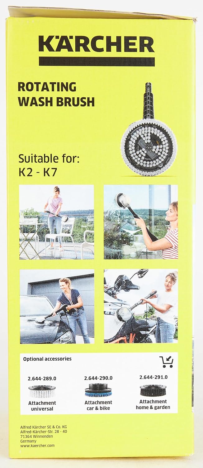 - Аксесоари за водоструйки Kärcher: Въртящата се четка за измиване е съвместима с водоструйки Kärcher K 2, K 3, K 4, K 5 и K 7.