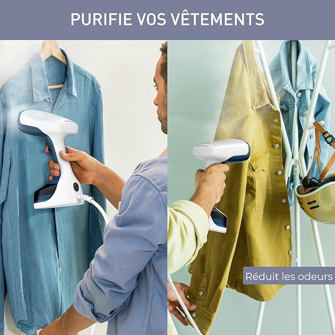 - Лесно и бързо отстраняване на бръчките: мощен и високоефективен преносим уред за пара с мощност 1400 W и дебит на парата до 25 g/min