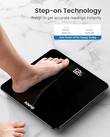 - ЕФЕКТИВЕН ПРОСТРАНСТВО И РЪКАВ: С размери само 10,2×10,2×0,8 инча (26x26x2,1 см), телесното тегло на Renpho го прави лесно за поставяне във всеки ъгъл на вашата баня, спалня или офис. Тънкият и минималистичен дизайн се вписва подхожда добре на вашия декор и добавя стилна нотка към вашето пространство.